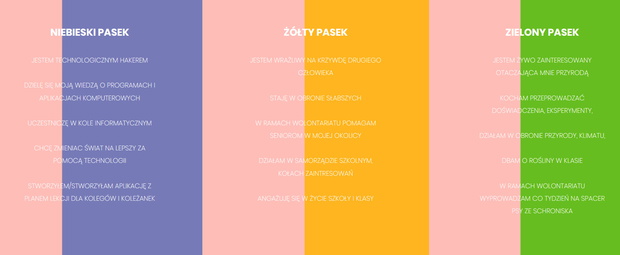Pasek niebieski trafić powinien do miłośnika nowoczesnych technologii, zielony do małego ekologa, który dba o przyrodę. Żółty to pasek, który powinno otrzymać każde dziecko wrażliwe na krzywdę drugiego człowieka – często stające w obronie słabszych, angażującego się w życie szkoły i klasy, urodzonego społecznika. Pomarańczowy to pasek dla przyszłych mistrzów sportu, a fioletowy dla indywidualisty i małego filozofa. Różowy natomiast to nagroda dla dziecka, które ma artystyczne zdolności i pasje. Nie musi to być od razu mały pianista. Różowy pasek należy się każdemu, kto kreatywnie zmienia świat wokół siebie – haftuje z babcią, szyje, śpiewa, recytuje. Wyrośnie z niego prawdziwy artysta!